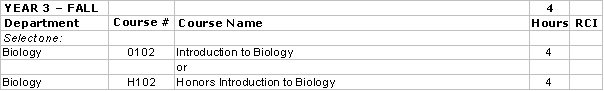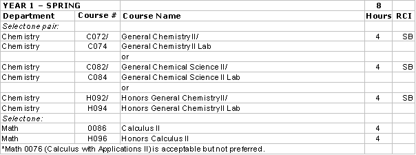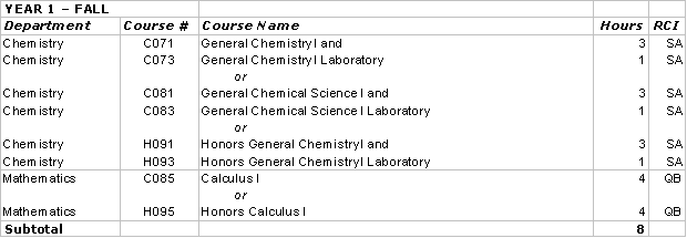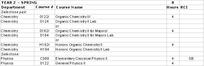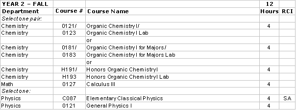 Calculus I, II, III; General Chemistry I, II w/ labs; Organic Chemistry I, II w/labs; calculus-based physics I, II; Biology 0102, 0203, W204; Physics 0184, 0187, 0188, 0231; and four biophysics elective courses.