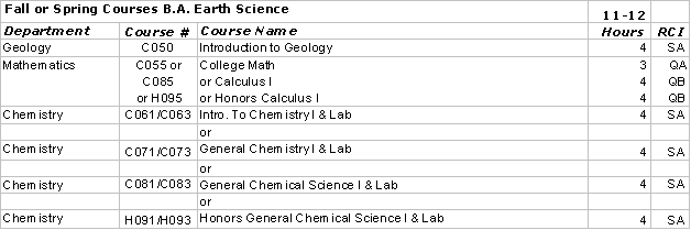 Fall Courses Recommended for Advancing Students in the Major for the B.A. in Earth Science