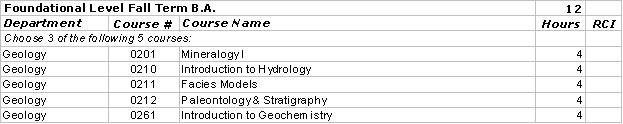 B.S. in GeologyCalculus I, II; general chemistry I, II; calculus-based physics I, II; Geology C050, 0201, 0211, 0212, 0261, 0301, W302. In addition, Field Geology (Geology 0352) taken in the summer; and three upper level science or mathematics electives, at least one of which must be in a discipline other than geology.