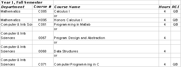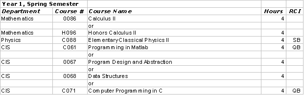 Academic Programs / Science & Technology MathematicsDr. Boris Datskovsky, Director of Undergraduate Studies Mathematics majors may select either the Bachelor of Arts (B.A.) program or the Bachelor of Science (B.S.) program. The B.A. program is a traditional program in pure mathematics. It is intended for students who plan to go to graduate school or to teach mathematics at a college or high school level after graduation. While the B.A. program has relatively few required courses, the required courses are academically demanding. The lack of heavy requirements is intended to provide students with an opportunity to explore their interests in and out of mathematics. The B.S. program, which has more required courses, has an applied flavor. It is intended for students who plan to seek employment in a mathematics-related field or join a graduate program in applied mathematics or a mathematics-related field upon graduation. Either program can be combined with the department's M.A. program, leading to the M.A. degree after five years of study. The department offers a joint program with the Department of Physics leading to the B.S. degree and a joint program with the Department of Economics leading to the B.A. degree. Students who plan careers as secondary school mathematics teachers may choose to take a five-year interdisciplinary program, offered jointly with the College of Education, that leads to a bachelor's degree in mathematics, teaching certification, and a Master's degree in Education. Basic Courses: Three semesters of calculus: Mathematics C085/H095, 0086/H096, 0127; linear algebra: Mathematics 0147 or 0148; and Mathematics 0247, 0248, 0251, 0347, W363. Mathematics, B.A. RequirementsIn addition to the basic courses, one of the following courses in Computer and Information Sciences: CIS C061, 0067, 0068, C071; and Mathematics W141 or 0200 or above (Mathematics W141 can only count if it is taken prior to Mathematics W205 and Mathematics 0247), W205, 0305, 0365 or 0377; and one additional mathematics elective course numbered 0200 or above.