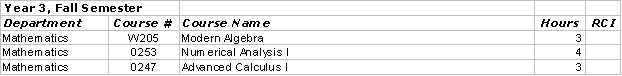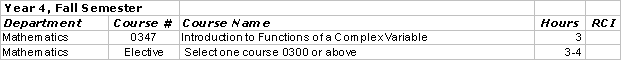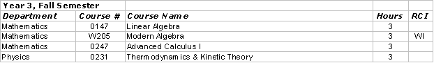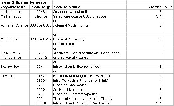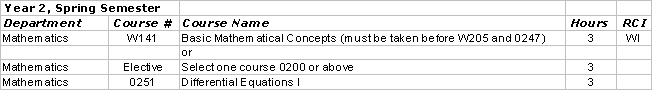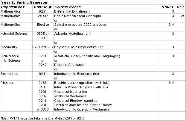 Mathematics, B.S. RequirementsIn addition to the basic courses, calculus-based physics I, II; two of the following courses from Computer and Information Sciences: CIS C061, 0067, 0068, C071; and Mathematics W205, 0233, 0253; and two science/mathematics electives taken from the following list: Actuarial Science 0305, 0306; Chemistry 0231, 0232; CIS 0211, 0242; Economics 0241; Physics 0187, 0188, 0201, 0202, 0211, 0231, 0306; or any mathematics course numbered 0200 or above (Mathematics W141 can count as one of the electives, provided it is taken prior to Math W205 and Mathematics 0247); and one additional mathematics elective course numbered 0300 or above.